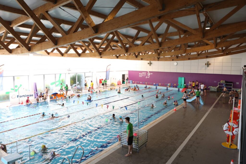 Moderno complexo com campo de futebol sintético, piscinas e salas para atividades desportivas e eventos.